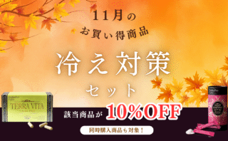 キャンペーン 冷え対策セット お得な「冷え対策セット」販売中!11月は冷え対策に効果的なテラヴィータ・ヒートエンザイムの購入がお得!さらに同時購入品も10%OFFに!この機会に是非お試しください。キャンペーン内容冷え対策セット(テラヴィータ・ヒートエンザイム)の購入で1... 2025年11月01日 キャンペーン