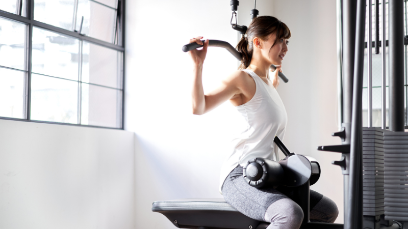 猫背と逆の動きをして縮こまった胸を開きましょう。ジムなら「ラットプルダウン」などのマシンがおすすめですが、タオルを使えばお家でも椅子に座りながら簡単にできます。